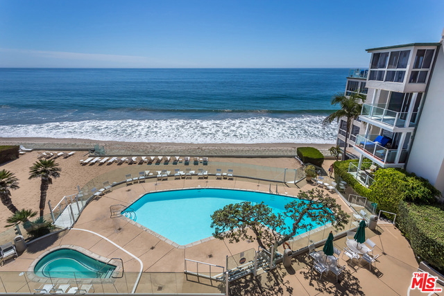 Located on a magical edge where land and sea meet. The ultimate Carbon Beach lifestyle and Malibu Outrigger resort living. This highly desirable TOP FLOOR unit boasts sweeping ocean expanses from all major living spaces. Capture breathtaking sunrises with your morning coffee from bed to the dramatic sparkle of the Queen's Necklace by moonlight. The flexible floor plan features a spacious, intimate patio accessible from both the bedroom and living room. Sun kissed open kitchen with a breakfast counter and large skylight. Wood burning romantic fireplace and tucked away Murphy bed just waiting for your guests. Unique building amenities include a private sandy beach area with shaded arbor, pool/spa and resident management team. Stroll beachside to fine dining, the Malibu Pier and beyond! Ideal close to town location.
