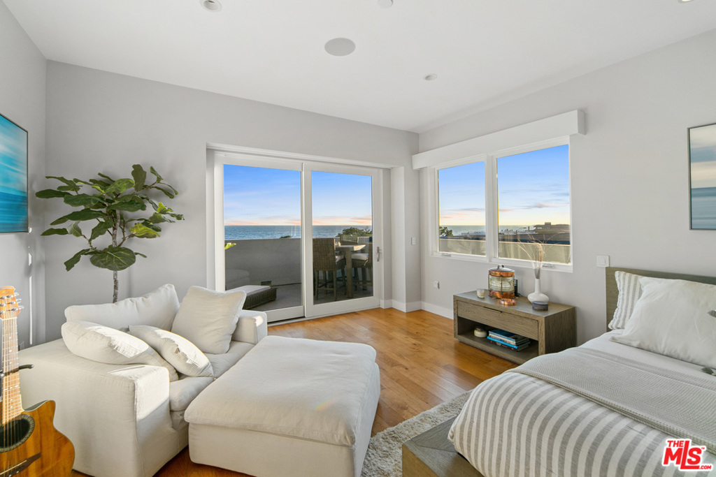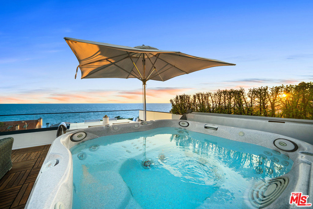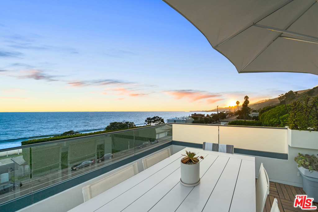 Incredible opportunity to own this stunning ocean view property located in the Residences at Carbon Beach. This rare gem offers ocean views from all living areas and master suite and sweeping coastline views from the first and second floor balconies. Incredible light and bright spaces with an open floor plan and high ceilings throughout. Gorgeous master suite with spa bath and two additional en suite bedrooms. Enjoy outdoor living from your private ocean view roof top terrace offering 180 degree view from Santa Monica to the Malibu Pier and Point Dume. Take in the breathtaking sunset views as you unwind by your private fireplace or soak in the 8 person Jacuzzi. This spectacular home offers a private gym, private elevator that serves the 4 car private garage and first and second floor. Luxury abounds including 10-11 ft. ceilings, satin walnut flooring, glass stainless stairways, marble countertops and much more. The best unit of all eight, with the best view. Owner installed a $75,000 sound system, custom roll down automatic shades and LED recessed fixtures throughout. Designed for the most discerning buyer.