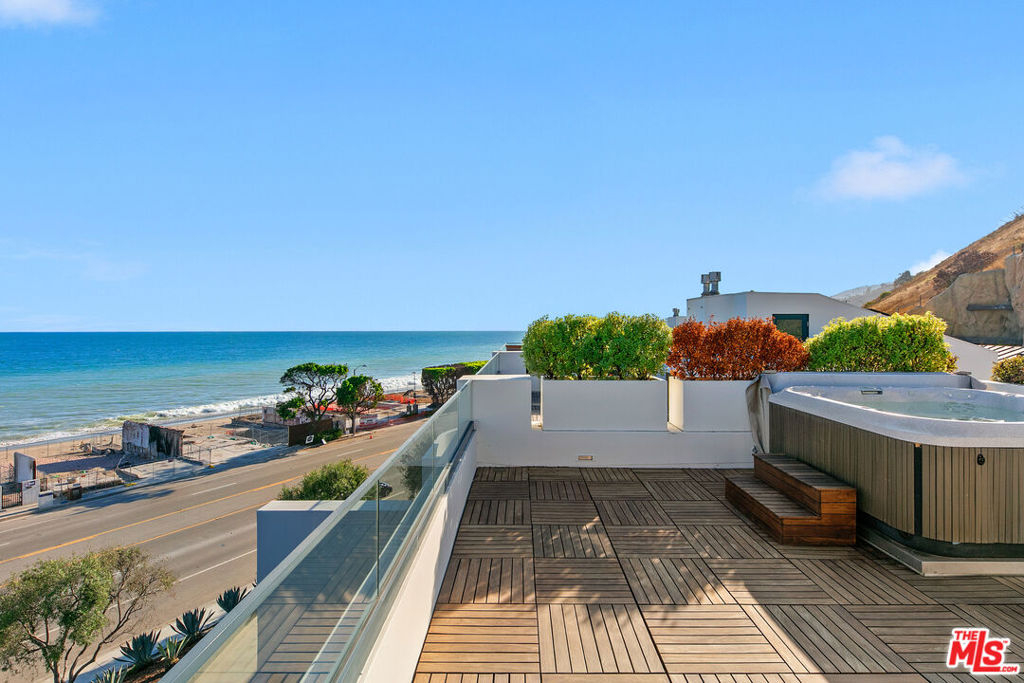 Experience the ultimate Malibu lifestyle at this ocean-view retreat in the exclusive Residences at Carbon Beach, just steps from Billionaire's Beach. Residence #7 is one of only eight homes, offering modern elegance, soaring ceilings, and abundant natural light throughout. Enjoy sweeping ocean views from every level, including the rooftop terrace with an 8-person spa and entertaining space. The main floor features an open layout with a chic breakfast nook, chef's kitchen with marble counters, top-tier appliances, dual dishwashers, prep sink, and wine fridge. The living room flows seamlessly to a private balcony for indoor/outdoor entertaining.Upstairs, the ocean-view primary suite boasts a private balcony and spa-like bath. Two additional en-suite bedrooms, a spacious sitting room, and laundry complete this level. Modern conveniences include a private elevator, and dual 2-car garages with bonus room. Located moments from Nobu, Soho, Malibu Farm, and more, this rare property blends luxury, privacy, and convenience in one of Malibu's most coveted settings.