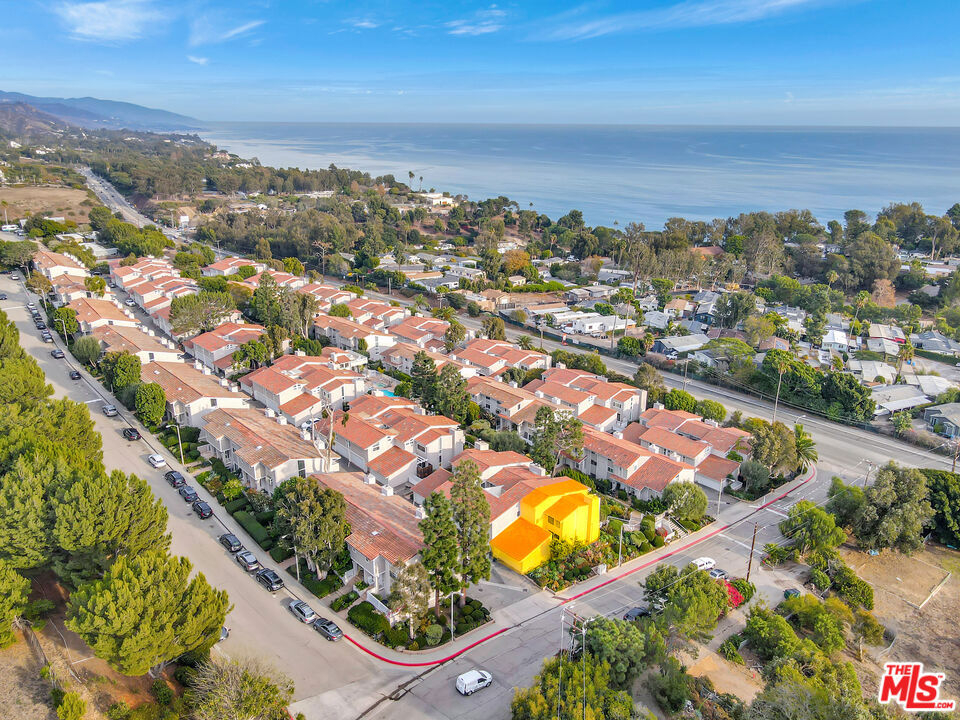 Ocean views at Malibu Villas with a terrific location within the complex. This end unit on the third row faces south & west and is flooded with natural sunlight. Enter into the foyer with a coat closet and proceed to the Living Room which features a cozy wood burning fireplace, sliding glass doors that open to a beautiful terrace, and enjoy the wet bar with lovely wood storage cabinets. Convenient main level powder room. The Dining Room has sliding glass doors that open to an atrium patio. The bright Kitchen has table space and also opens to patio with BBQ. Upstairs are two spacious bedrooms, baths and generous closets. Primary bedroom has ocean views and another lovely private outdoor space from which to enjoy them. Primary bath has double bowl vanity. The 2 car attached garage with washer and dryer brings you directly into the kitchen. This popular complex has a recreation room, pool and sauna, as well as earthquake insurance. Residents here enjoy access to the famous Paradise Cove beach across the street and ideal central location moments from Point Dume Village, Zuma Beach, and Trancas Country Market.